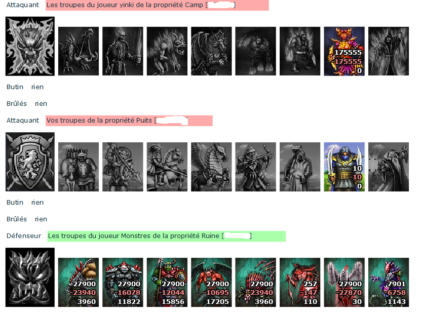 Les mercenaires arrivèrent près de la ruine en avance, ils contemplaient ce chef d'œuvre d'architecture tombé en ruine... Ils apercevaient les guetteurs sur les remparts. Ils scandèrent un chant démoniaque pour se donner du courage puis foncèrent à l'assaut, tel une meute de loups sur une proie sans défense. Ce fut un véritable carnage, les soigneurs monstrueux ne purent soigner qu'une infime partie des pertes infligées par les mercenaires suicidaires au moment où le gros de la troupe arriva sur place. Les deux seigneurs furent, comme leurs mercenaires précédemment, éblouis par la magnifique architecture de la ruine. Ils furent aussi stupéfaits de voir tant de cadavres joncher le sol. Ce dernier était gorgé de sang et ne pouvait plus aspiré une seule goutte. De véritables mares de sang s'étaient formées. L'armée rasa la ruine et les survivants de la première attaque. La légion de soigneur du Démon ressuscita toutes les troupes perdues. Mais ils ne pouvaient plus rien pour les pauvres mercenaires... Les deux Seigneur rentrèrent au cœur de la ruine, et se partagèrent équitablement un trésor inimaginable, plus de quatre-vingts-dix-huit mille Gemmes Noires. Et à coté de ce fabuleux trésor, ils trouvèrent entassés plus de six cents mille pièces d'or. L'héroïne du Démon, qui avait l'œil a force de raser des ruines par dizaines, trouva un parchemin pour son Maître.
